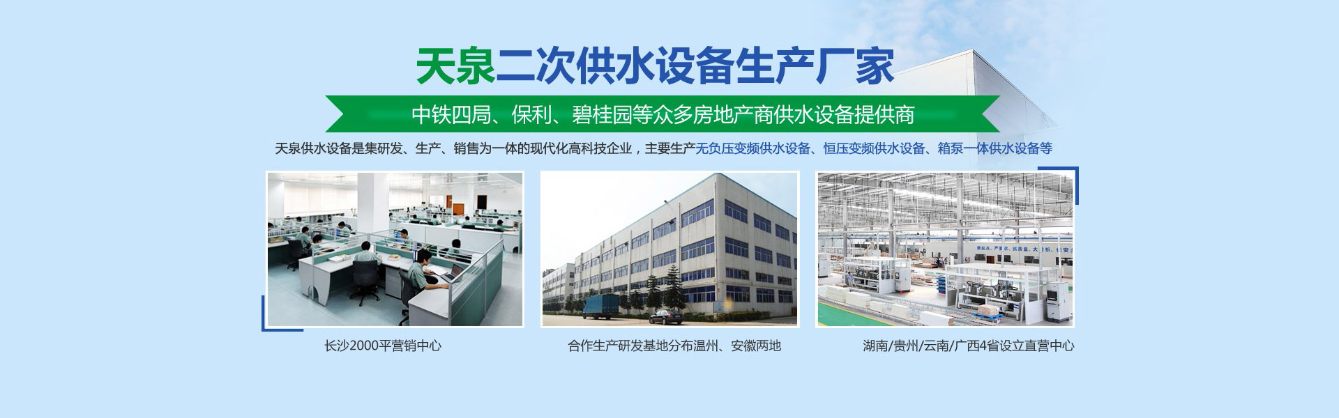 長(zhǎng)沙天泉供水設(shè)備有限公司位于長(zhǎng)沙雨花經(jīng)濟(jì)開發(fā)區(qū)。公司是集研發(fā)、生產(chǎn)、銷售為一體的現(xiàn)代化科技型企業(yè)公司生產(chǎn)銷售的產(chǎn)品有無(wú)負(fù)壓變頻供水設(shè)備、自來(lái)水加壓泵站、變頻調(diào)速恒壓供水設(shè)備、智慧標(biāo)準(zhǔn)泵房、智慧水務(wù)、一體化預(yù)制泵站、循環(huán)水系統(tǒng)工程等二十幾大類別。